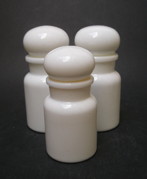 VINTAGE WHITE GLASS APOTHECARY JARS / BOTTLES x 3 (MADE IN BELGIUM )