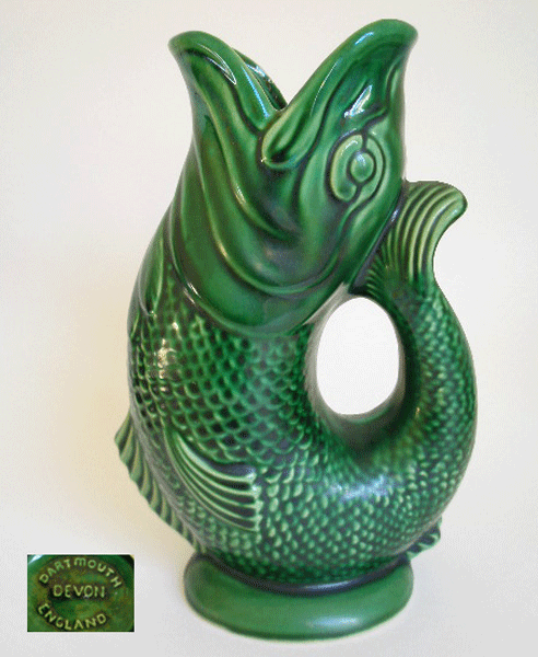 Here is a delightful gurgle glug jug in green by Dartmouth pottery. It is in the traditional fish shape and does indeed produce a very loud and wonderful glug-glug sound as it is poured. This sound is produced when the hollow handle which is the tail of the fish, fills with air as the jug is tilted and poured. Traditionally used as a water jug for whisky. Marked to the base DARTMOUTH DEVON ENGLAND.