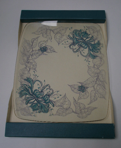 Here is a large plate by Chance Glass in the delicate Honeysuckle pattern designed by Peter Tysoe in 1970. This is in turquoise and lilac on clear glass. It comes in the original box and has not been used. It would make a pretty dressing table tray or would equally be good for sandwiches or cakes. The box is marked CHANCE GLASS A MEMBER OF THE PILKINGTON GROUP
