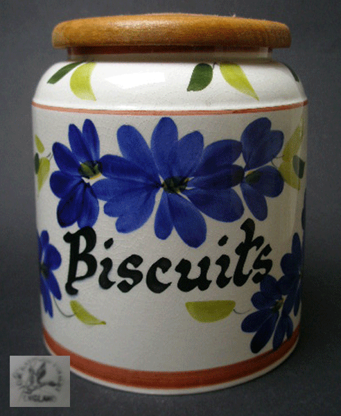 Dating to the 1960s is this large storage jar by Toni Raymond. It is hand-painted in the blue flower pattern and has Biscuits written on it. It has a wooden lid. Marked to the base TONI RAYMOND POTTERY ENGLAND