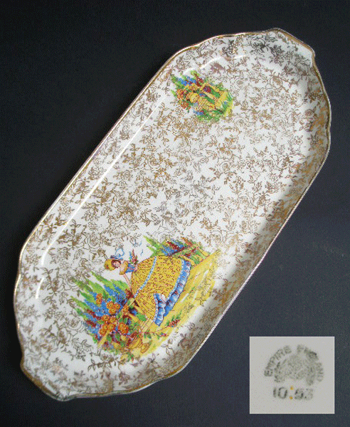 Here is a vintage Crinoline Lady sandwich or serving plate by Empire. It has a crinoline lady in one corner and a garden urn of flowers in the other and has all over gilt decoration. Marked to the base EMPIRE ENGLAND 10.53 and impressed number 733