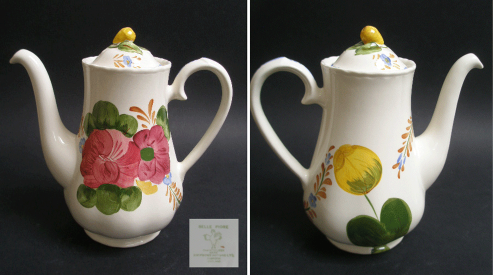 Here is a vintage coffee pot in the lovely hand-painted Belle Fiore design by Simpsons Potters. Marked to the base BELLE FIORE CHANTICLEER WARE SIMPSONS ( POTTERS ) LTD COBRIDGE ENGLAND