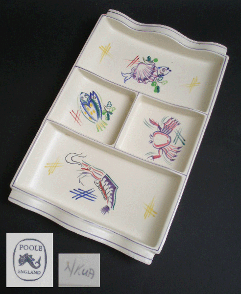 Here is a vintage Poole Pottery sectioned tray for serving Hors D Oeuvres. It has hand-painted seafood designs to each section. A lovely piece and nice matt glazeSigned to the base NKUA and has the POOLE ENGLAND mark.