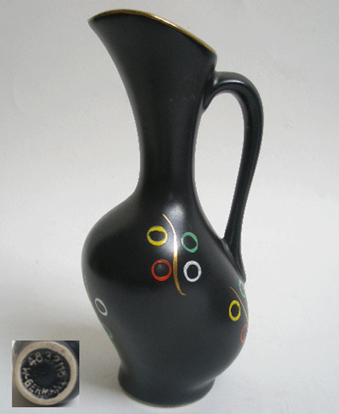Dating to the 1950s is this small West German vase or jug. It has a matt black finish and has been decorated with blue, yellow, red and white circles around a gilt line. It is a very stylish shape with a swollen belly and a handle. Marked to the base W-GERMANY 4832/18