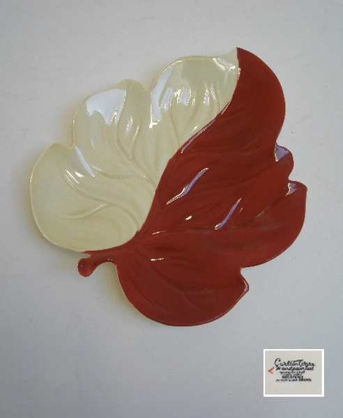 Dating to the 1950s is this leaf plate by Carlton Ware. It is a reddish brown and off white glaze which has been handpainted. Marked to the base CARLTON WARE HANDPAINTED MADE IN ENGLANDTRADEMARK REGISTERED AUSTRALIAN DESIGN