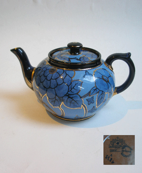 Dating to the 1920s is this earthenware teapot by Gibson & Sons. The inside is glazed over the brown clay but the outside has been hand-painted with a pretty blue floral design and outlined in gilt. The handle and spout are black glazed with gilt decoration. Because it is earthenware it is quite robust for making a good cup of tea. Marked to the base GIBSON & SONS BURSLEM ENGLAND REDG No T 833