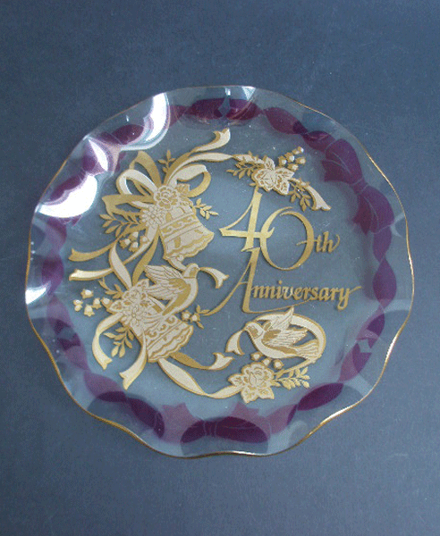 Here is a Ruby Wedding cake plate by Chance Glass. It has a fluted gilded edge and pretty design of bells ribbons flowers and doves in gold with a ribbon border in red. It reads 40th Anniversary