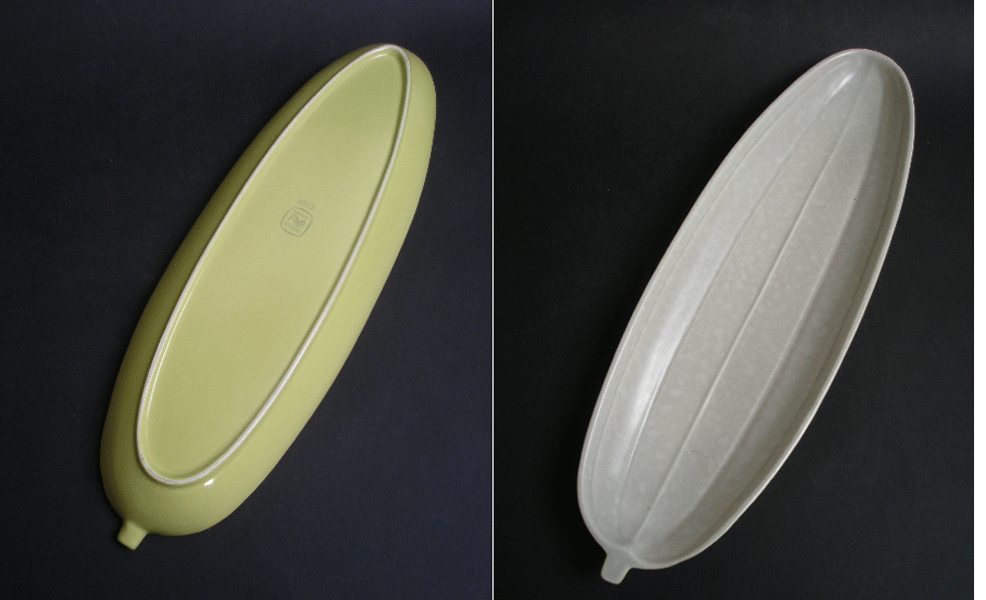 These cucumber dishes were designed by John Adams in the 1930s and produced until the 1970s.This one is the large size in lime yellow and seagull with seagull on the top. Marked to the base POOLE with the dolphin ENGLAND C103. We have other items in this twintone range.
