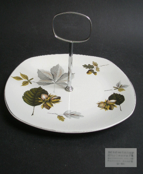 Dating to 1962 is this cake plate in the Nuts in May pattern designed by John Russell for Midwinter pottery. It has a chrome tone metal handle which unscrews for easy cleaning. Marked to the base Midwinter Stylecraft STAFFORDSHIRE ENGLAND FASHION SHAPE 1-56