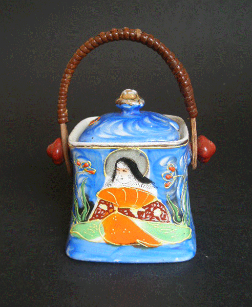 Here is a pretty porcelain preserve pot by Klimax of Japan. It has been hand- painted showing a Japanese lady in traditional dress and on a matt blue ground. The lid has a gilt knop and an opening for a spoon. It has a cane work handle. Marked to the base HANDPAINTED KLIMAX MADE IN JAPAN P A T