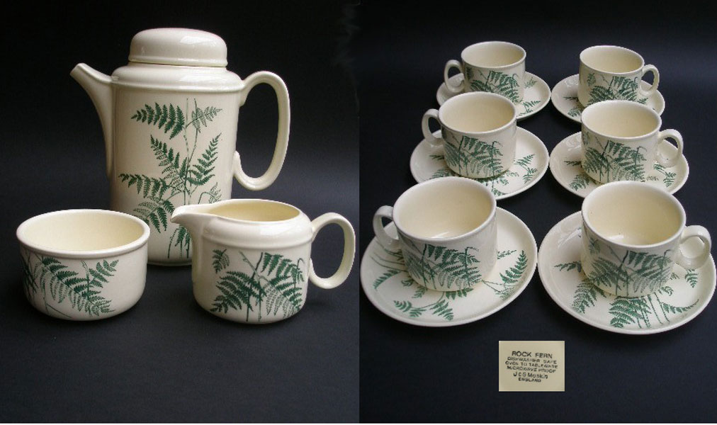 Here is a 1970s coffee set from the renowned manufacturers J & G Meakin. The pattern is called Rock Fern and was first introduced in 1958 although on this Trend shape (c.1979) the design has changed completely but still kept the same name. This was quite commonplace. There are two colourways for this design and this set is cream with green fern leaves. It consists of a coffee pot, milk/cream jug and sugar bowl, six cups and six saucers. A fabulous shape, colour and design. Marked to base ROCK FERN DISHWASHER SAFE OVEN TO TABLEWARE MICROWAVE PROOF J & G Meakin ENGLAND.