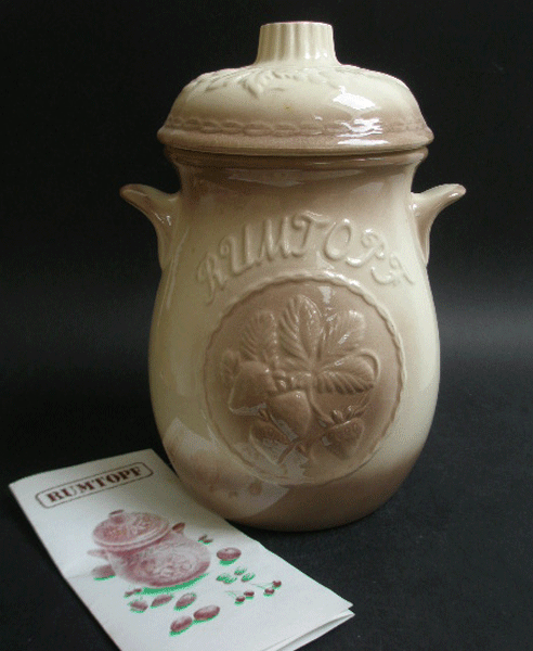 Here is a vintage Rumtopf from the Boots Cookshop range. It dates to the 1970s and still has the original leaflet inside. This is in a light beige colour and resembles the West German Rumtopfs in design. It has a bunch of cherries on one side and strawberries on the other. The leaflet gives the history of the Rumtopf, how to use your Rumtopf, and ways in which the Rumtopf can be enjoyed.