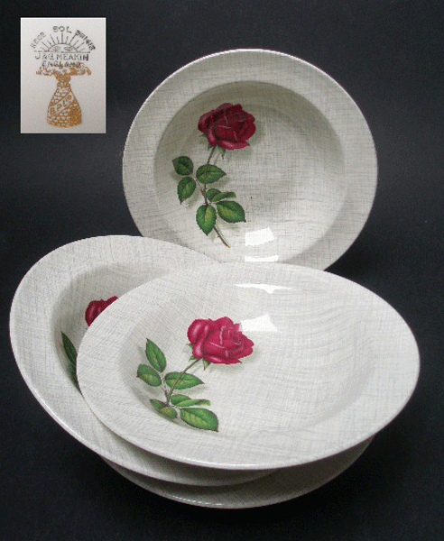Dating to the 1950s is this set of four J & G Meakin rimmed bowls in the Rosina pattern. The design is of a red rose on a crosshatched background. These have the early mark to the base REGd SOL 391413 wit the sun face J & G MEAKIN ENGLAND