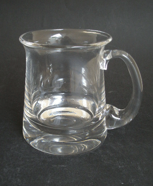 Here is a very heavy beer tankard by Dartington Glass. It was designed by Frank Thrower in the 1980s during the merger with Wedgwood and called the Brendan Beer Tankard. It holds a pint of beer.