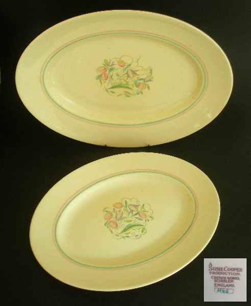 Here is a set of two different sized oval serving platters in the Susie Cooper design Dresden Spray. They have the cream background. Marked to the base A SUSIE COOPER PRODUCTION CROWN WORKS BURSLEM ENGLAND