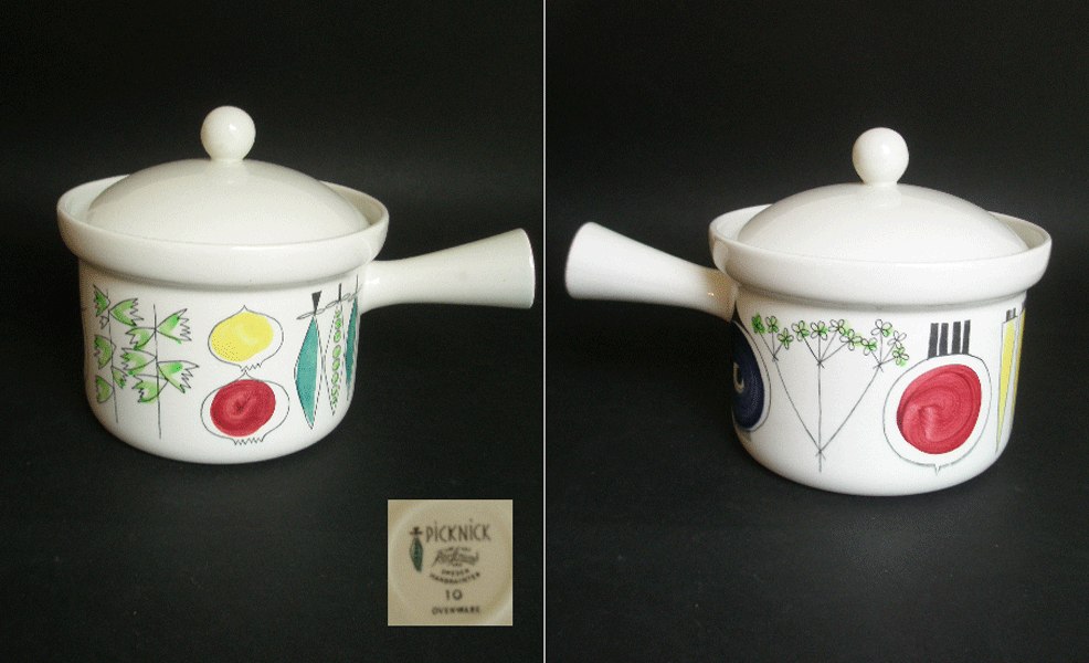 Here is an ovenware casserole or saucepan with lid by Rorstrand of Sweden. It is handpainted with the - PICKNICK - design by Marianne Westman around the outside. This design of stylised vegetables was first brought out in the 1950s. This casserole shape dates it to the 1960s. Marked to the base PICKNICK RORSTRAND SWEDEN HANDPAINTED 10 OVENWARE