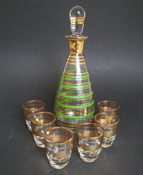 Dating to the 1950s is this decanter and six shot glasses. The decanter has a teardrop stopper and is decorated with gold and green bands. The glasses have gold bands.Great vintage set.
