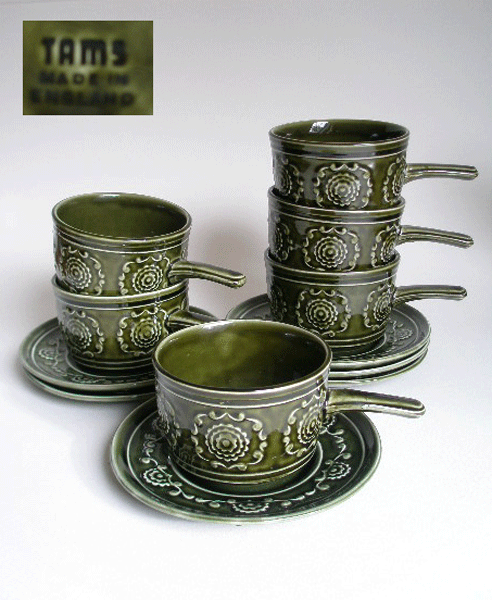 Dating to the 1960s/70s is this set of six very retro green soup cups and saucers made by Tams Ware. They are great to use for soup and stack neatly when not in use. They have a raised design to the cup and stand. Marked to the base TAMS ENGLAND.