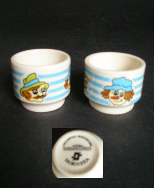 Here is a pair of lovely egg cups made by the renowned Hornsea pottery and designed to promote Mackintosh s Toffee and Mallow. They date from the 1970s and were sold with a small Toffee and Mallow Easter egg.They have blue and white stripes and four faces of a farmer and a scarecrow around them. Great retro pieces for display and very funtional. Marked to the base HORNSEA with the Hornsea symbol EXCLUSIVELY DESIGNED FOR Mackintosh s Toffee & Mallow.