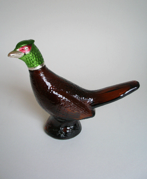 Here is a vintage Avon, brown glass, empty After Shave bottle in the shape of a ring neck pheasant. It has a green and gold-tone head and still retains the original label which reads AVON PHEASANT OLAND AFTER SHAVE LOTION