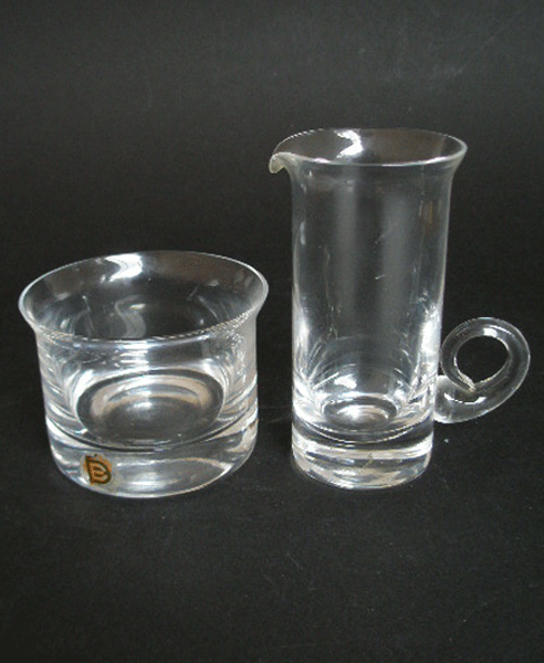 Designed by Frank Thrower in 1972 for Dartington Glass is this stylish cream and sugar bowl. They were nicknamed -Cream and Sugar Daddy. The sugar bowl still retains the original gold Dartington sticker.