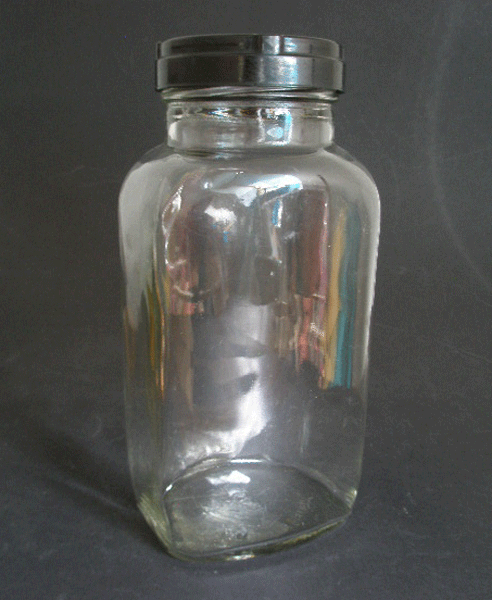 Dating to the 1950s is this large glass sweet jar with a black plastic screw on lid. These make good air tight storage jars. The lid is round but the main body is rectangular. Marked to the base 19 1958 5 MADE IN ENGLAND