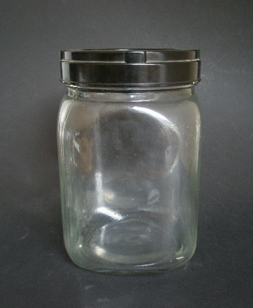 Dating to the 1950s is this glass storage jar with a black plastic screw on lid. This has a square, squat shaped body with a round lid. Originally it would have stored sweets in a sweet shop but could be used for any large quantities of food stuff. Marked to the base BRITISH MADE