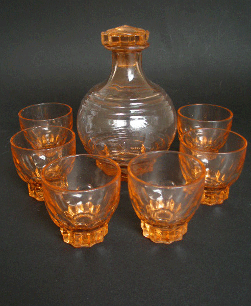 Dating to the 1940s/50s is this French decanter set. It is in a pinkish glass and consists of a decanter with six small glasses. Marked to the base FRANCE