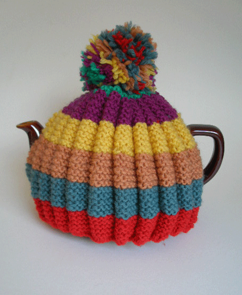 Here is a tea cosy hand-knitted from a vintage pattern. It is knitted in 100% wool with horizontal stripes in bold colours . It has one large pom-pom to match. This has a double thickness as the wool crosses over on the inside. Keeps your tea nice and hot. Seen here on a two pint teapot.