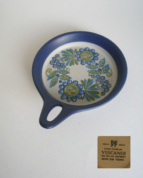 Dating to the 1970s is this very small skillet pan by Figgjo Flint of Norway. It is in the Tor Viking design by Turi Gramstad-Oliver. This wonderful Turi design is a stylised blue and green flower and the main body in dark blue.It has a hole in the handle making it suitable for hanging and is suitable for use on a gas or electric hob. Marked to the underside FIGGJO FLAMEWARE VULCANUS FOR GAS AND ELECTRICITY MADE IN FF NORWAY.DECOR TOR VIKING. Impressed number 12011