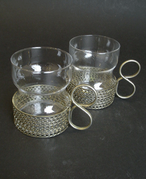Dating to the 1950s is this pair of Iittala Finland Tsaikka tea glasses with stainless holders designed by Timo Sarpaneva. The glasses can be removed from the holder for washing or for use on their own. Great vintage items.