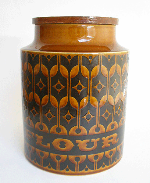 Heirloom was the first design brought out by Hornsea pottery when they branched out into tableware. It was designed by John Clappison in 1967 and proved to be very popular. This is a large storage jar for FLOUR and it has a wooden lid. Marked to base HORNSEA ENGLAND 1975 HEIRLOOM
