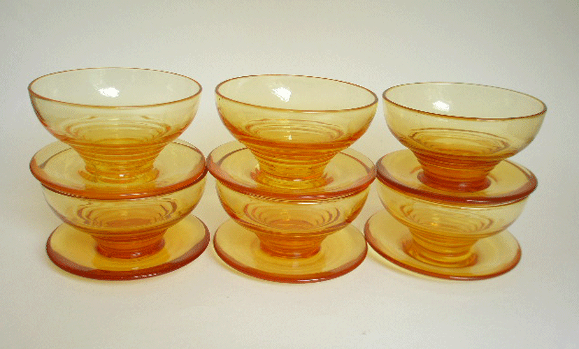 Dating to the 1930s are these amber glass bowls on a fitted saucer. They are in the Stratford rings pattern by Stuart Crystal. Etched to the base STUART ENGLAND RD 719538.