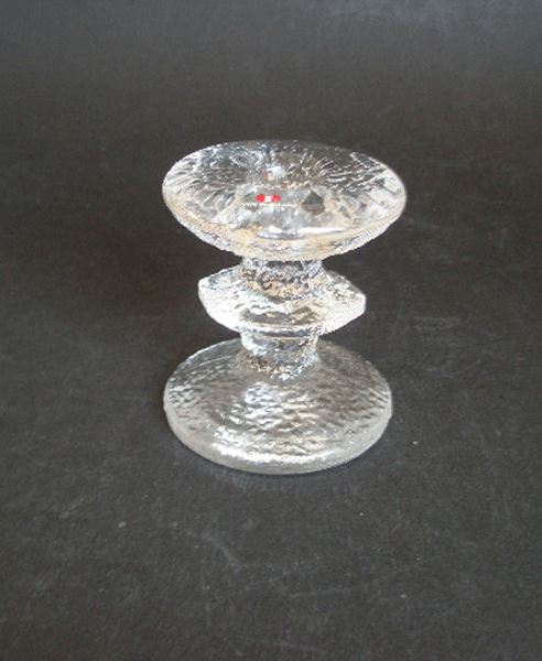 This is a design classic. An Iittala glass one ring candlestick in the Festivo design. This was first designed in 1966 by Timo Sarpaneva. It has an icy texture to it that beautifully reflects light and it holds a standard size tapered candle.This still has the original red label with the i and MADE IN FINLAND.