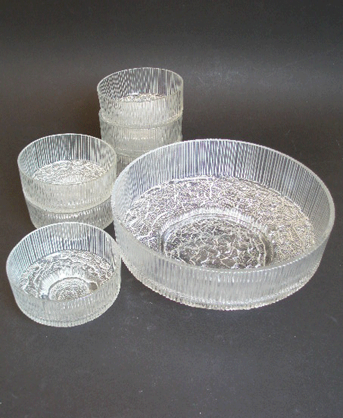 Dating to the 1970s is this 7 piece fruit set by Ravenhead. It is in the Topaz design which is heavily textured to the underside and smooth to the inside. It consists of one large bowl and six small bowls.