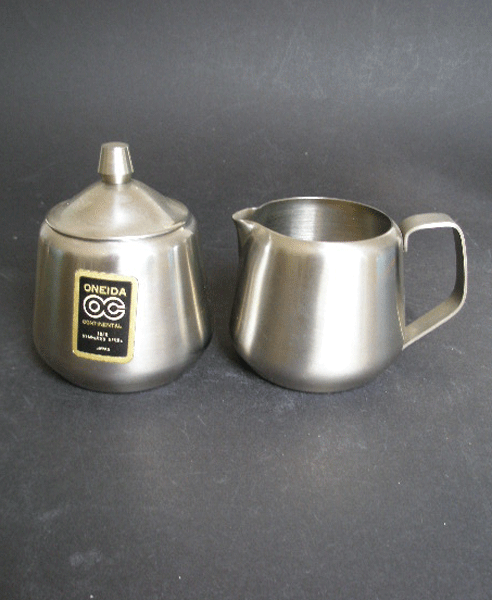 Dating to the 1960s is this stainless steel milk or cream jug and sugar bowl by Oneida Continental. They come in a matt finish. The lidded sugar bowl still has the original label and looks like it has not been used.Both pieces are marked to the base ONEIDA CONTINENTAL OC 18/8 STAINLESS STEEL.