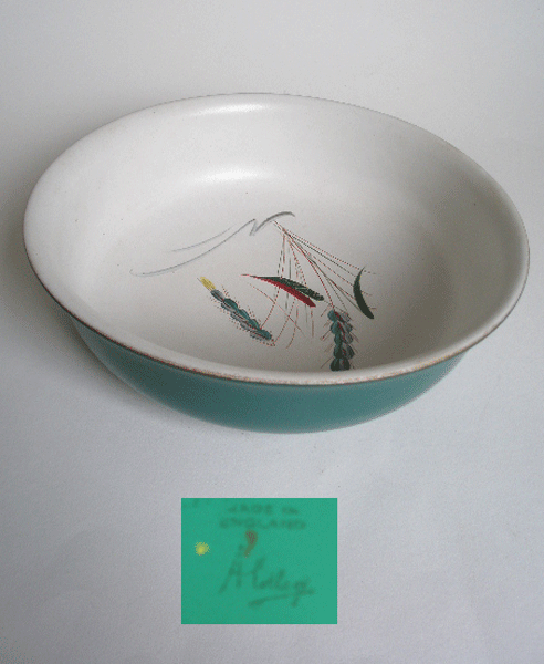 Here is a Denby serving or salad bowl in the Greenwheat design.It has a green glaze to the outside and a matt white glaze to the inside with the Greenwheat pattern.It is a good size bowl .Marked to the base DENBY MADE IN ENGLAND and signed A.COLLEGE.