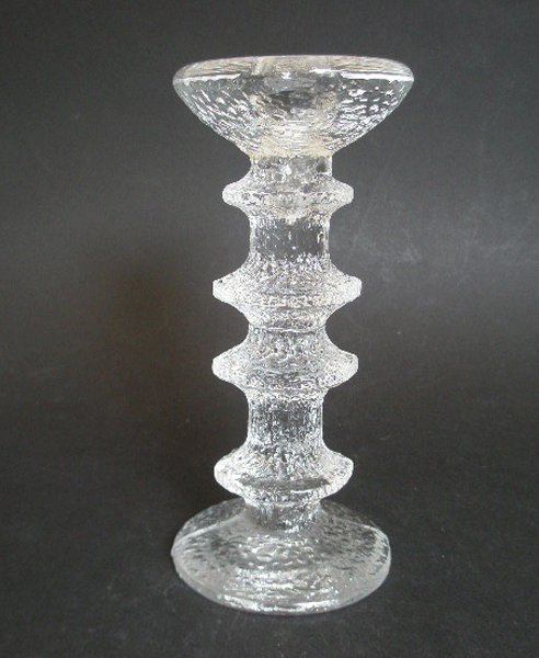 This is a design classic. An Iittala glass four ring candlestick in the Festivo design. This was first designed in 1966 by Timo Sarpaneva. It has an icy texture to it that beautifully reflects light and it holds a standard size tapered candle.