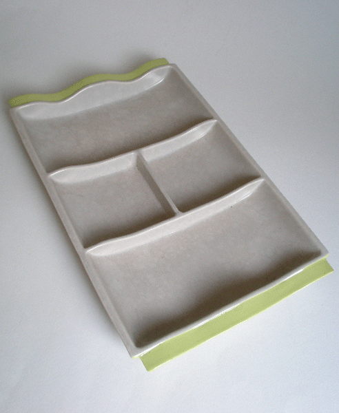 Here is a vintage 1950s Poole Pottery sectioned tray for serving Hors D Oeuvres. It is in the Twintone range Lime Yellow and Seagull (C103).Marked to the base POOLE ENGLAND TWINTONE with the Dolphin symbol.