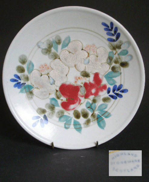 Here is a hand-painted plate in the Varied Floral design trialled by David Grant in the early 1980s. It has holes in the pottery on the base with a picture wire so that it can be hung on the wall as a decorative plaque if wished. Marked to the base HIGHLAND STONEWARE SCOTLAND.