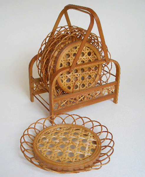 Dating to the 1970s is this set of six cane-work coasters in a carrying stand.They have a glass base underneath the cane-work making them quite sturdy. the carrier has moveable handles.