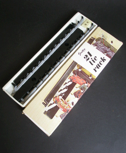Dating to the 1960s is this plastic tie rack by Stratton. It has the screws to fit it to the wall and will hold 24 ties. This is still in the original box and has not been used.It has 24 space saving fold back hangers. The arms fold out to hang your tie and as stated on the box the ties are secure with arms folded back.Marked to the box STRATTON 24 TIE RACK PATENT No. 1204256 No.2752 MADE IN ENGLAND