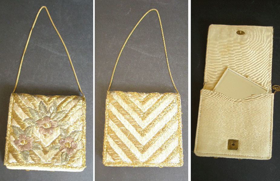 Dating to the 1920s or 1930s is this small Deco evening bag or purse. It has a gold coloured delicate chain handle and opens up from the base at the front the whole flap to a concertina which is lined in cream taffeta. It has a small pocket to the back which still has the original mirror lined and backed in matching fabric. The outside is embroidered with gold and silver thread to form a chevron pattern on the back which continues to the front with the addition of flowers in pale green and pink. Label inside reads FOREIGN.