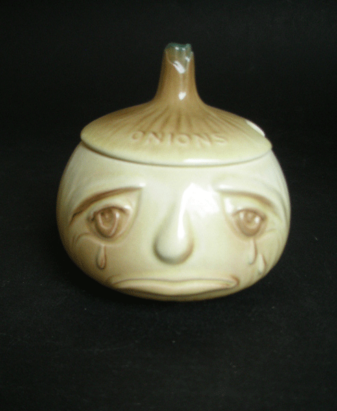 Here is an onion pot by Sylvac. It is in an onion colour and has a crying face to the front. The stalk of the onion acts as a handle for the lid which has a slot for a pickle fork or spoon. The word ONIONS is across the top. Marked to the base ONION 5128 SYLVAC MADE IN BRITAIN and it also has the original Sylvac sticker.
