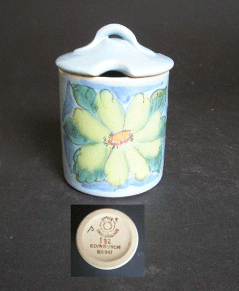 Here is a Buchan Stoneware jam pot with lid in the Edinburgh pattern.It was made at the Portobello kilns in Scotland which closed in 1972.Marked to the base BUCHAN PORTOBELLO SCOTLAND FINEST STONEWARE 192 EDINBURGH M5-247.