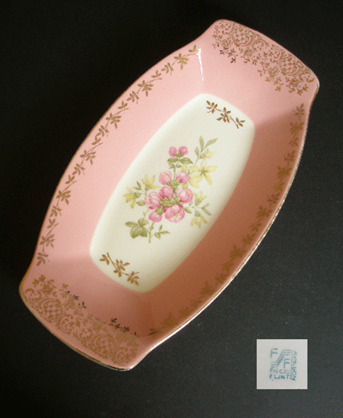 Dating to the 1950s is this sandwich or serving plate by Figgjo Flint of Norway. It has a pink border decorated with a gilt pattern and the centre has pink and yellow flowers on a white ground. Marked to the base F F FIGGJO FLINT NORWAY.
