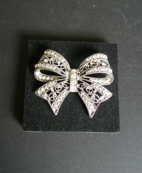 Here is a large vintage silver tone tied ribbon bow brooch or shawl pin. It has clear Rhinestones set in filigree work and fastens with a rollover pin on the back. A good quality piece of jewellery.