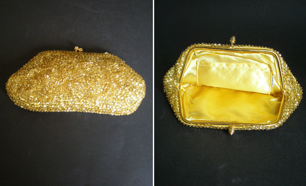 Dating to the 1960s is this gold sequinned and beaded evening bag. it has a gold-tone kiss clasp at the top and opens up to a golden yellow satin lining inside. It has one side mirror pocket stitched into the lining which is labelled HAND BEADED