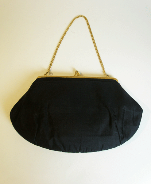 Dating to the 1960s is this black silk evening bag with a gold-tone clasp and chain handle. It is also lined in a silk taffeta and has a mirror pocket which is labelled MADE IN INDIA CENTRAL COTTAGE INDUSTRIES EMPORIUM JANPATH N. DELHI