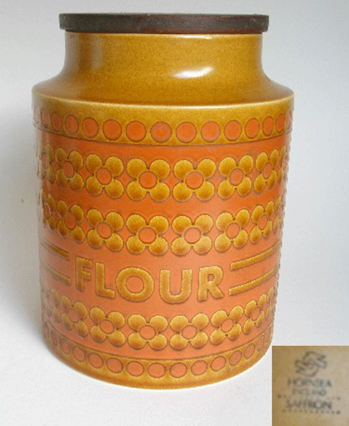Dating to the 1970s is this flour storage jar by the renowned Hornsea Pottery. It is in the Saffron pattern designed by John Clappison. It has a dark brown wooden lid with a rubber seal. It has FLOUR inscribed on the front. Marked to the base HORNSEA ENGLAND SAFFRON